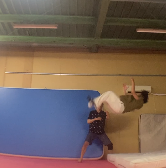 生徒さんの成長に併せ、ヘリコプテイロ・ゲイナー・サイドフリップなどのスタイリッシュな技にもチャレンジしていきます。(ダンス・パルクール・トリッキングに対応)